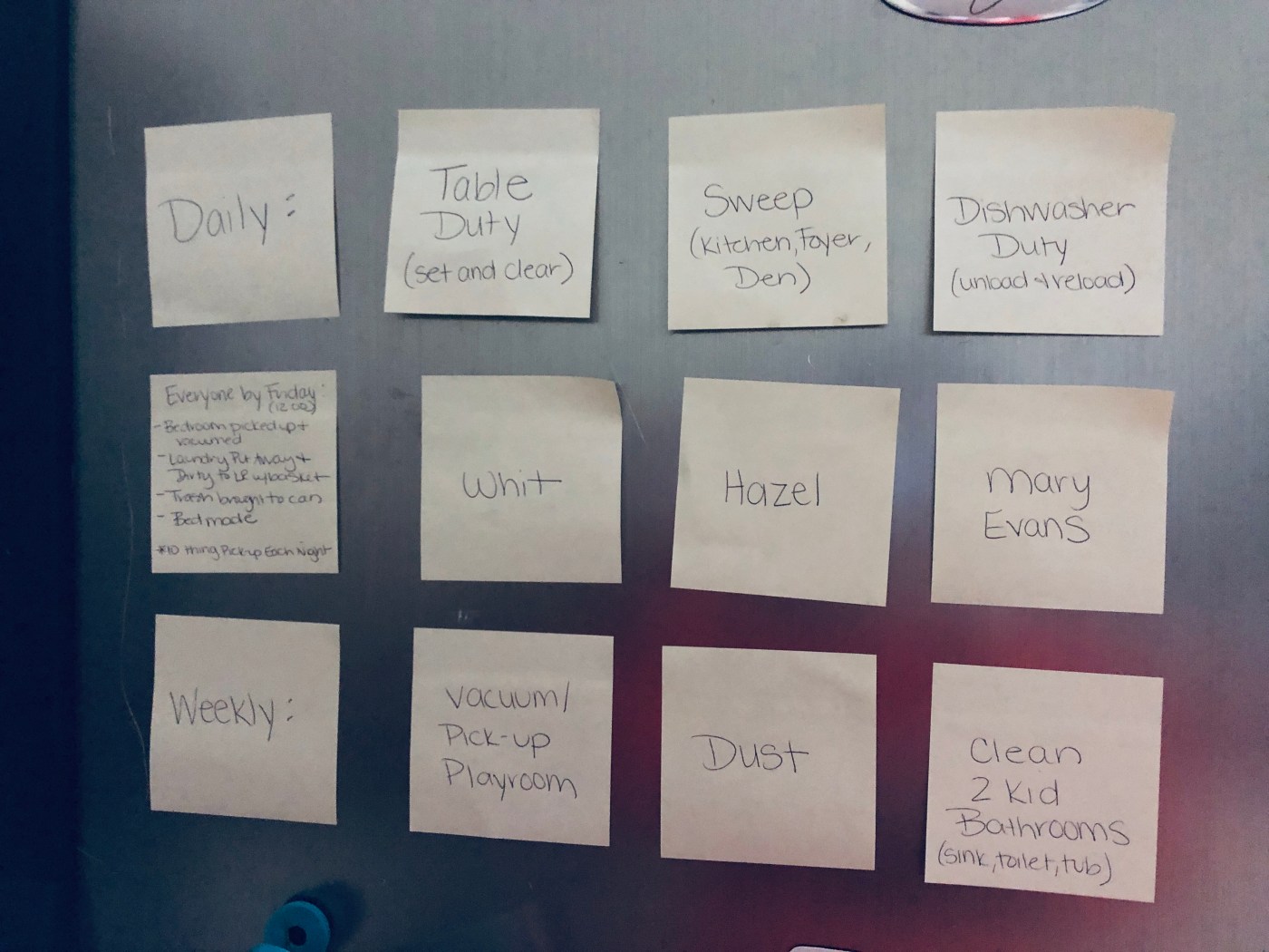 It took a minute for me see what she was referring to, but once I did, I immediately responded, “Oh we don’t actually do that!” with a little laugh. I explained that it was a chore-chart-rotation-thingy that I attempted to copy from a more put-together mom the summer before, that only lasted for a few weeks on and off. I kept it up in hopes that we would get it together at some point and stick to it. But that hadn’t happened so far…